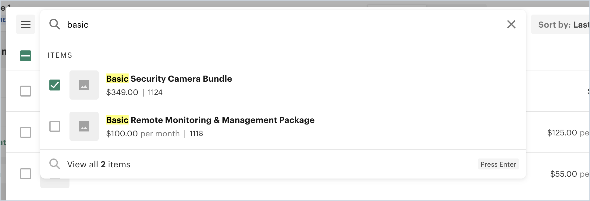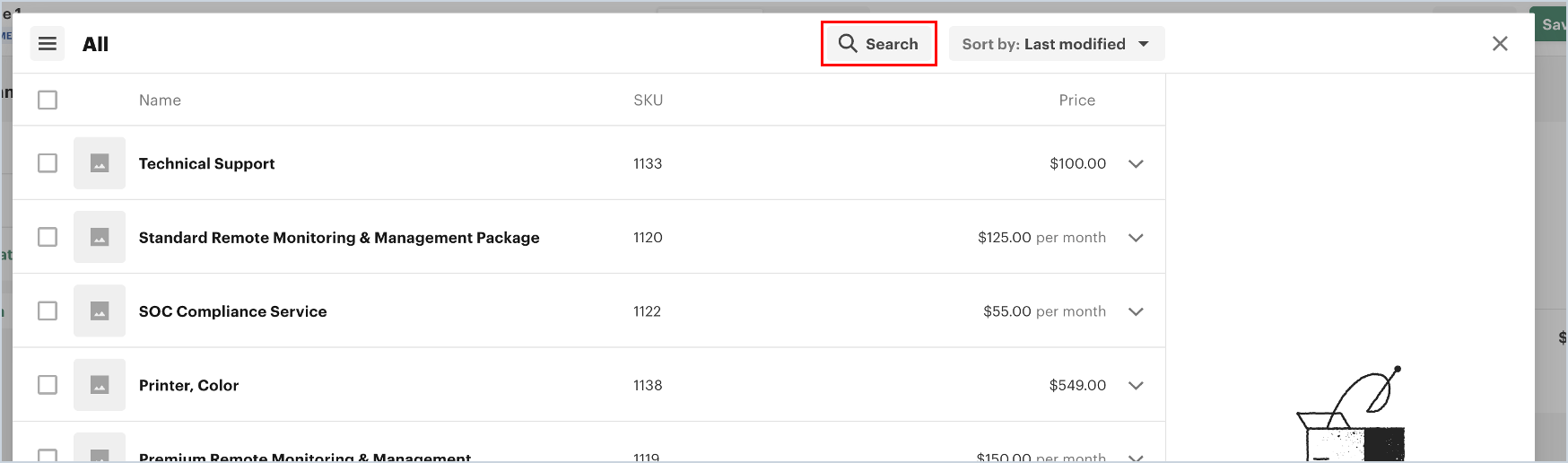 Begin typing to narrow the product list. From there, you can check the box of the items you wish to add. Continue to search or scroll and add all the products/services you need for the quote.
