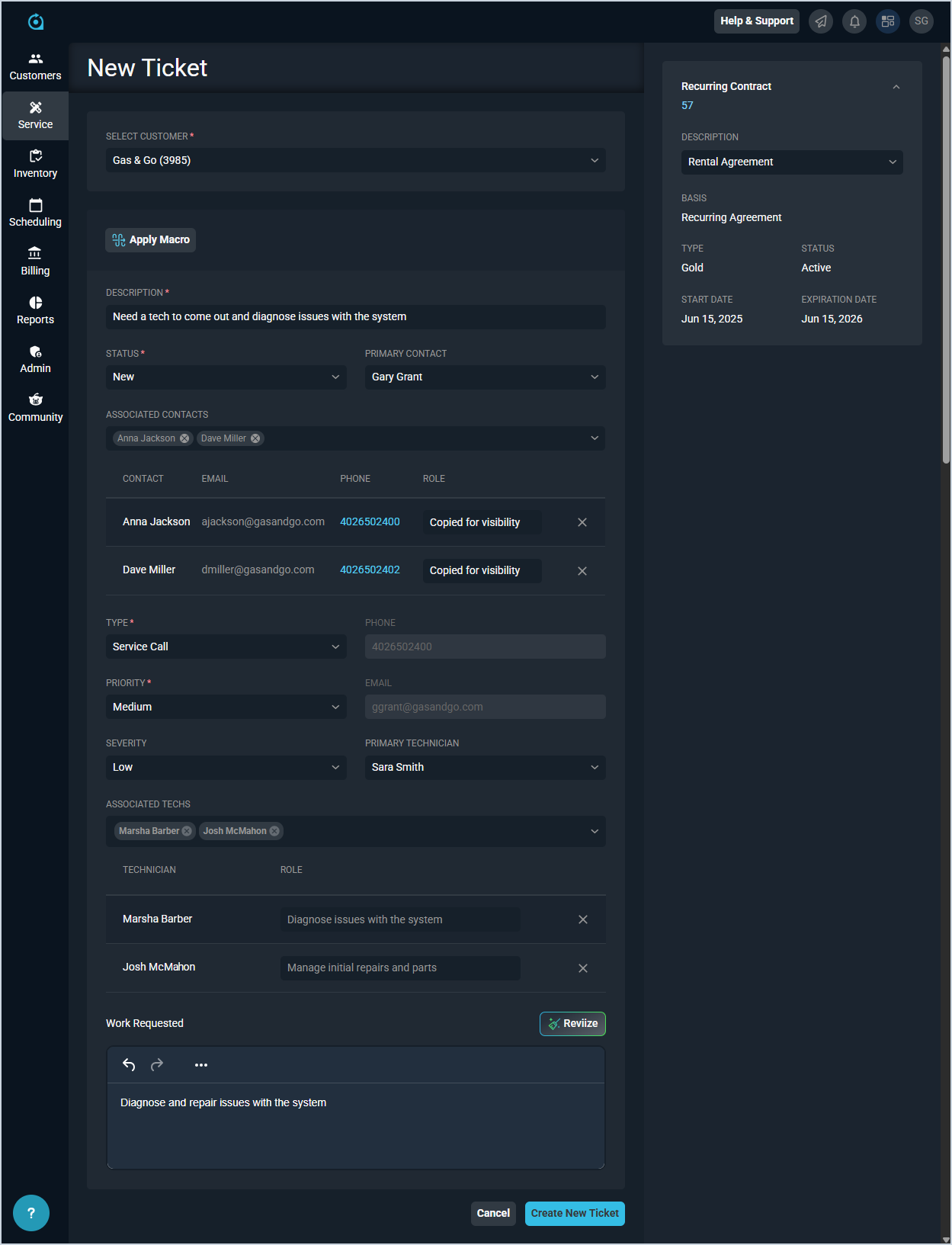 - Take advantage of our in-app AI tool to craft the perfect Work Requested for the ticket by clicking the Reviize button. See the AI Powered: Reviize Tool article for more information about using our in-app AI tool.