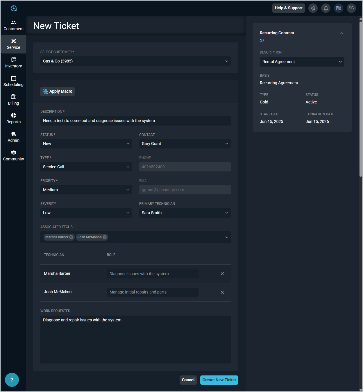 The New Ticket and Edit Ticket screens allow you to enter and edit ticket requests for your customers. Information for the customer associated with the ticket displays in the customer information section.