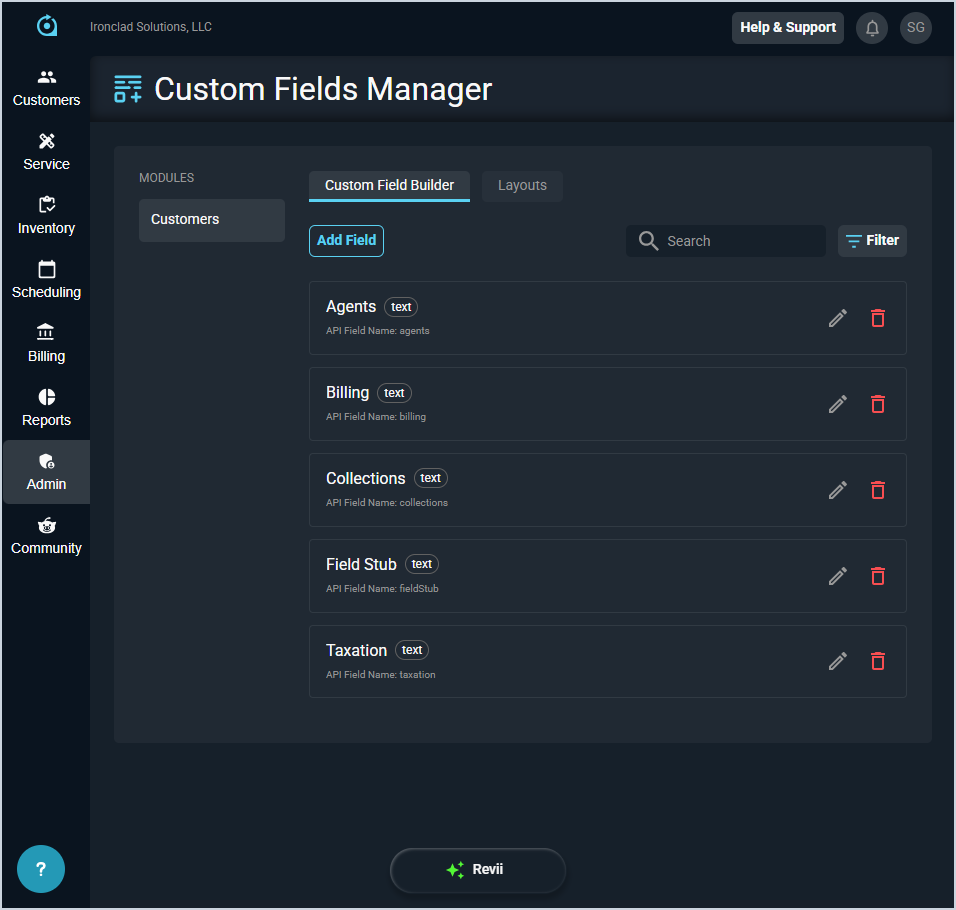 The Custom Field Builder tab in the Custom Fields Manager allows you to create and define custom fields for specific areas of the system. You can choose from a variety of field types, including text, text area, number, date, dropdown, multi-select, and checkbox, and configure additional settings to ensure data is captured consistently and accurately. See the Add/Edit Custom Fields article for more information about creating new custom fields.