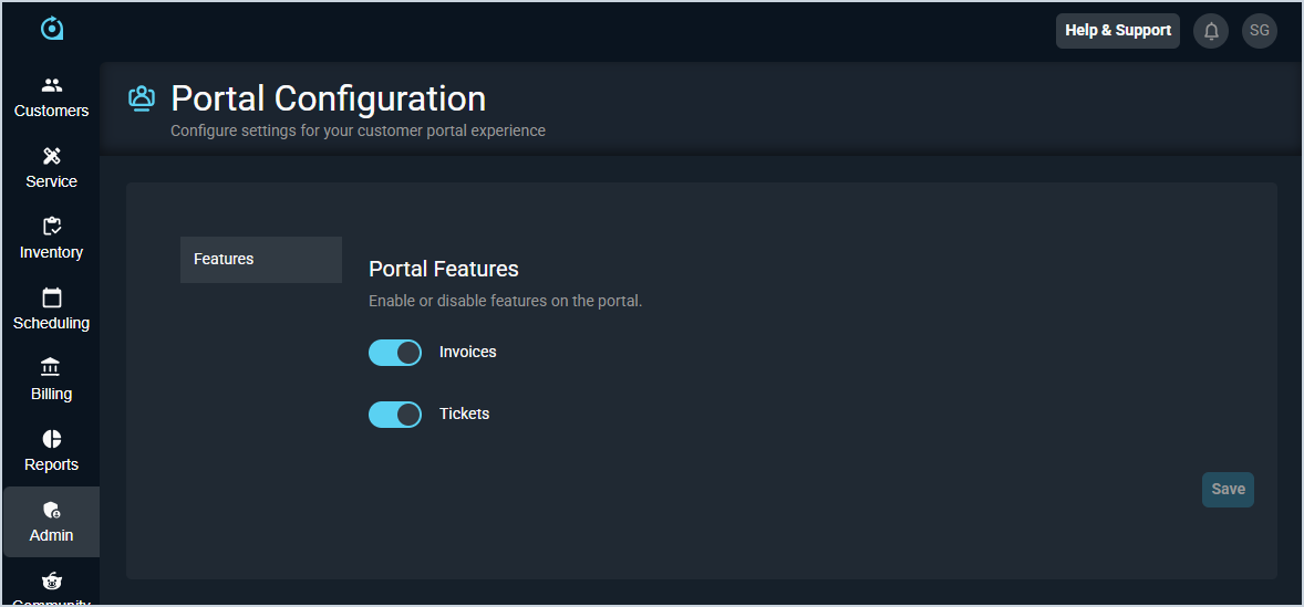 The options in the Portal Features section control whether specific items display in the portal for your customers. The Invoices option allows your customers to view and export invoices, pay their bills, and manage payment methods on their account. The Tickets option allows your customers to create new tickets, view and export existing tickets, and communicate with your technicians using ticket activity notes. If either option is unchecked in this section, the related functionality will be unavailable in your customer portal.