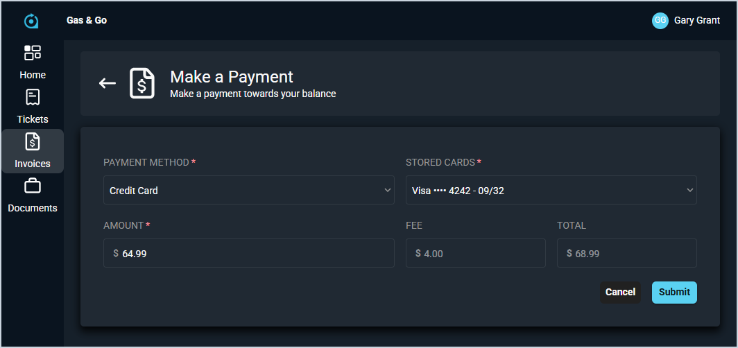 The Invoices screen in the Customer Portal displays every invoice created for the customer and allows end users to make payments on their account by clicking the Make a Payment button. The Make a Payment screen allows end users to select from their list of saved payment methods, enter the amount they'd like to pay, and submit the payment.