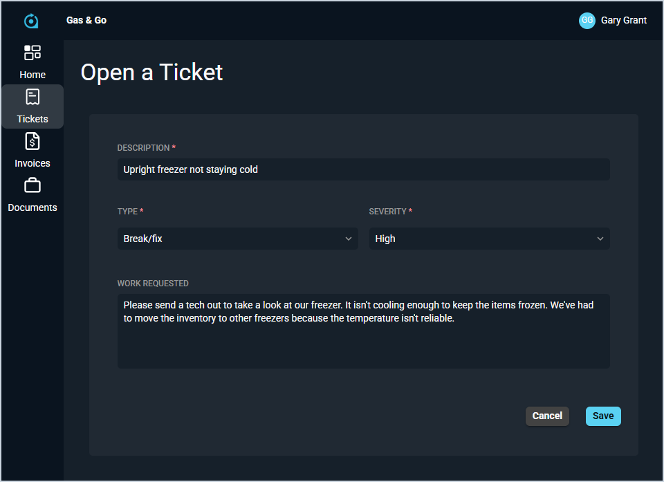 The Open a Ticket screen in the Customer Portal allows end users to request work by creating tickets that populate directly in your database. Customers using the portal can enter the description, type, severity, and work requested, but you can still modify all available ticket fields for the ticket in PSA. Once the ticket is created, you can manage, assign, and dispatch them as usual in your Rev.io PSA instance.