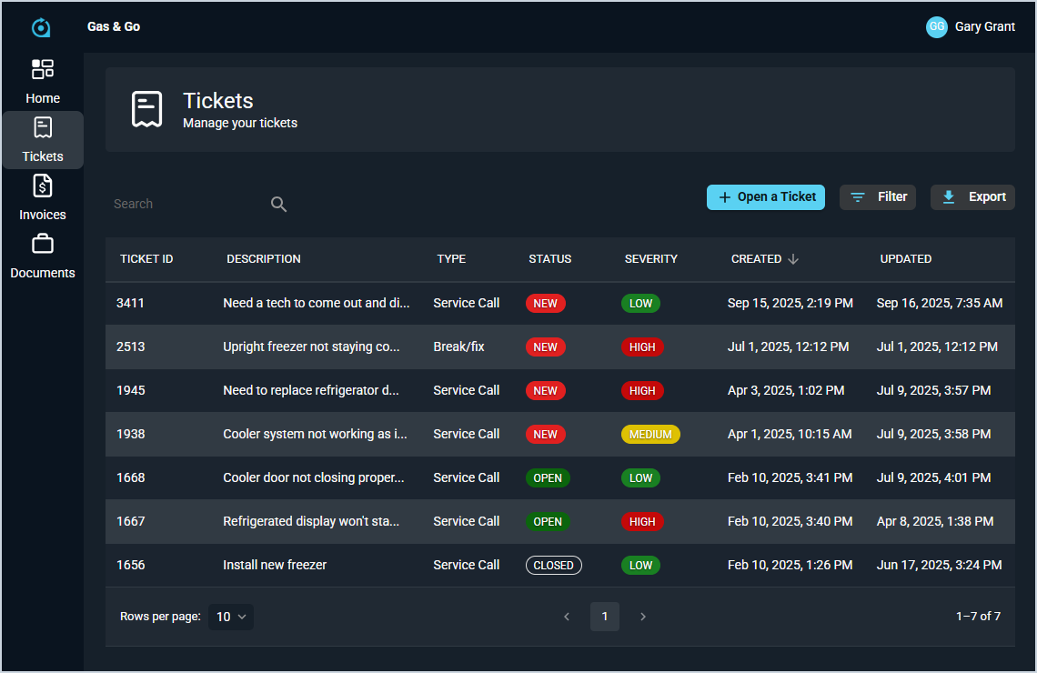 The Tickets screen in the Customer Portal displays every ticket created for the customer. From this screen, end users can search for tickets, view them in detail, create new ones, and even export a .CSV file of their tickets.