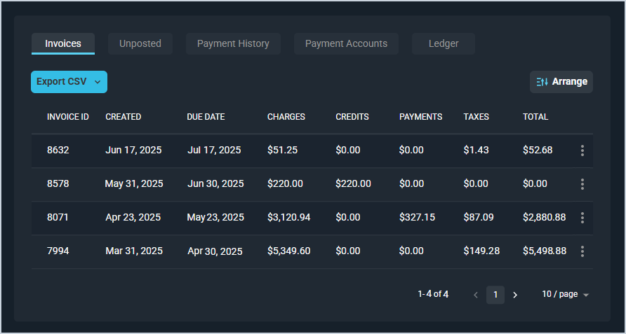 - Export information on this tab by clicking the Export CSV button and selecting whether to export the current page or all data for the Invoices tab. The selected information will download as a .CSV file.