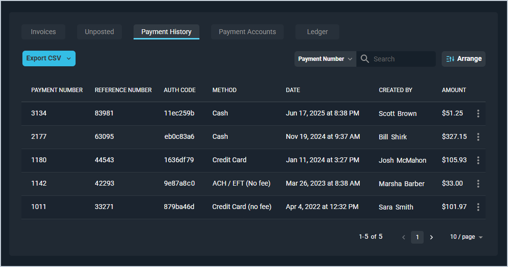 - Export information on this tab by clicking the Export CSV button and selecting whether to export the current page or all data for the Payment History tab. The selected information will download as a .CSV file.