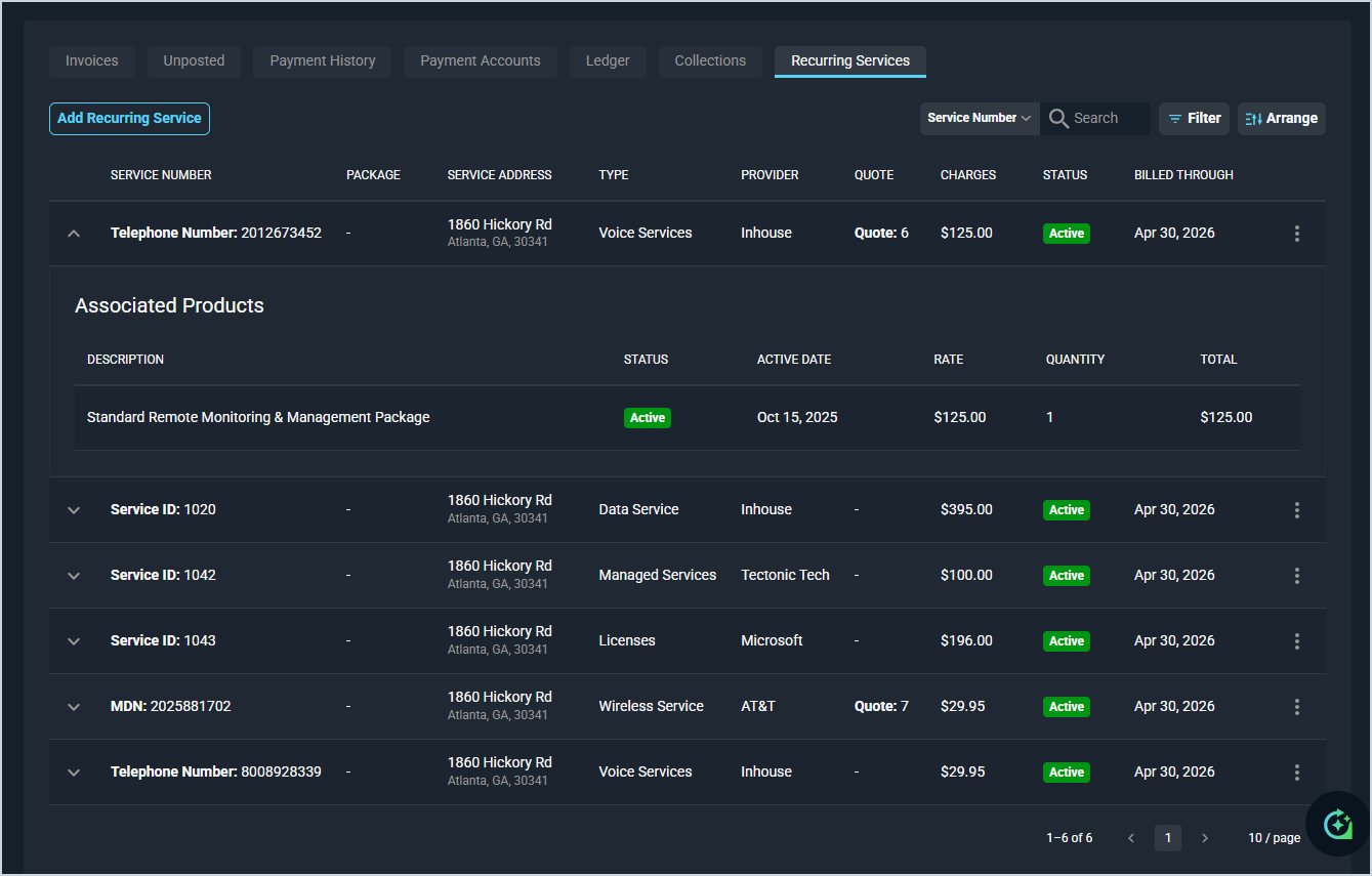 The Recurring Services tab in the Billing section of the customer profile displays all recurring services associated with the customer account. Each service row can be expanded to view its associated products. From this tab, you can review service details, track which services are linked to quotes, and add new recurring services to the account.