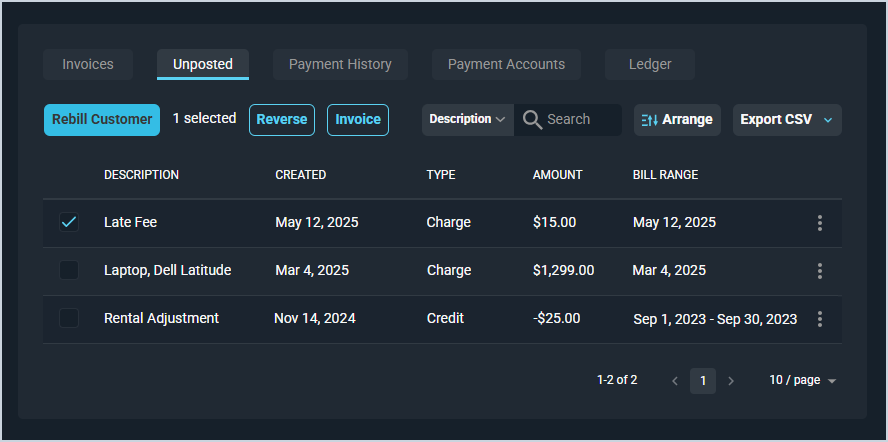 The Unposted tab on the Customer Profile screen contains a list of all unposted transactions on the customer record, displaying major details in the list view, including description, created date, type, amount, and bill range. Unposted transactions are items that have been added to the customer's account, but have not yet posted.