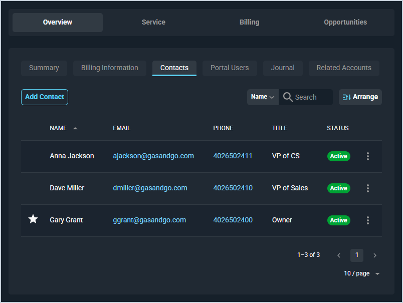 | 1 | Primary | A star icon displays at the start of the row if the contact is the primary contact on the customer record. NOTE: The primary contact always displays at the top of the list regardless of how you sort the tabs.