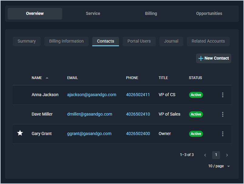 | 1 | Primary | A star icon displays at the start of the row if the contact is the primary contact on the customer record.