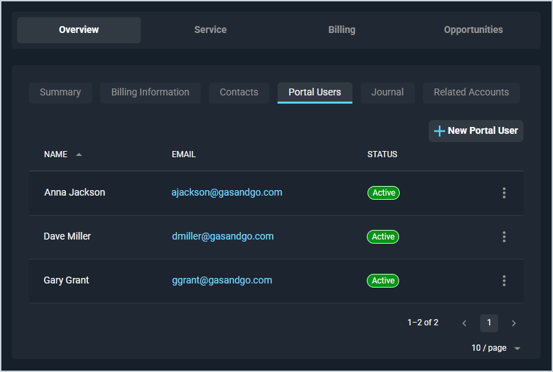 The Portal Users tab on the Customer Profile screen contains details for all portal users on the customer record, including name, email, and status. In order for a user to log into the Customer Portal, where they can create and manage tickets, invoices, and payments, they must exist as a portal user on this tab.
