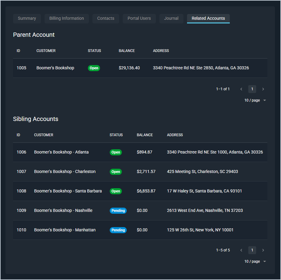 The Related Accounts tab on the Customer Profile screen contains a list of all customer accounts linked to the customer record, including parent, child, and sibling relationships.