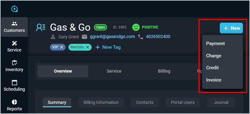 The New button on the Customer Profile screen opens the Quick Actions menu, allowing you to create payments, charges, credits, and invoices on the customer account. This menu is accessible from every tab on the Customer Profile screen and allows you to manage essential account functions quickly and efficiently.