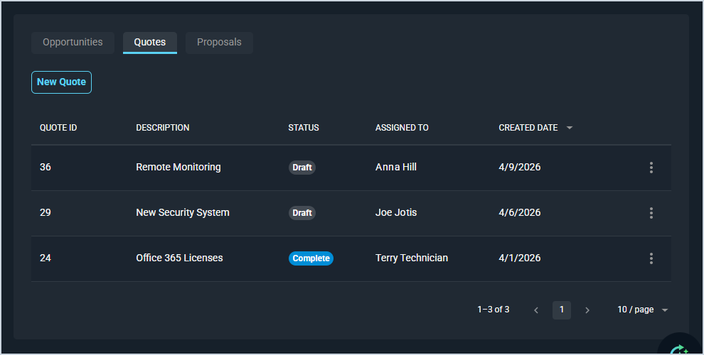 - View the quote to make any changes or additions by clicking the ellipsis at the end of the row and selecting View from the menu options. See the Create/Edit Quotes article for more information.