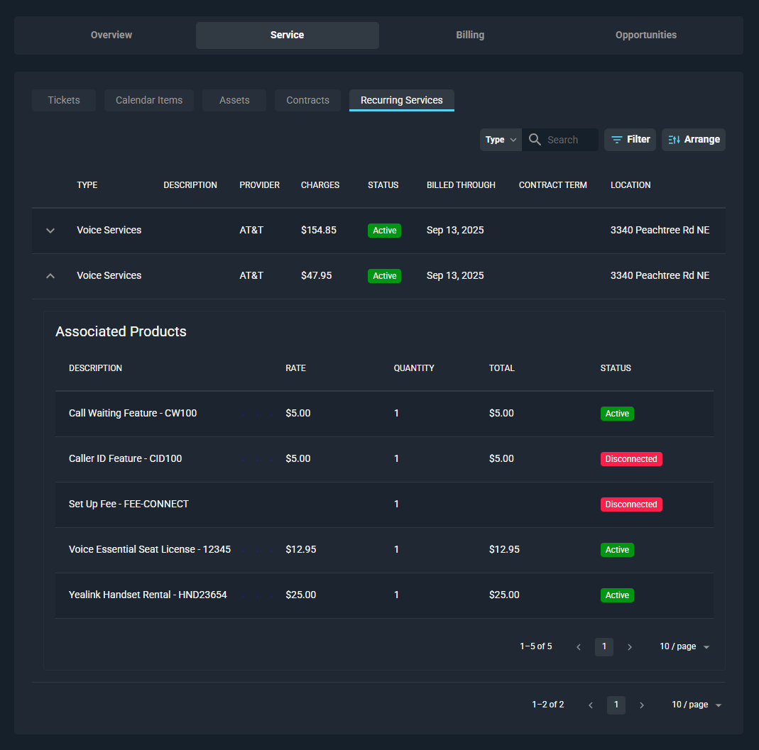- View products associated with the service by clicking the arrow icon at the start of the row.