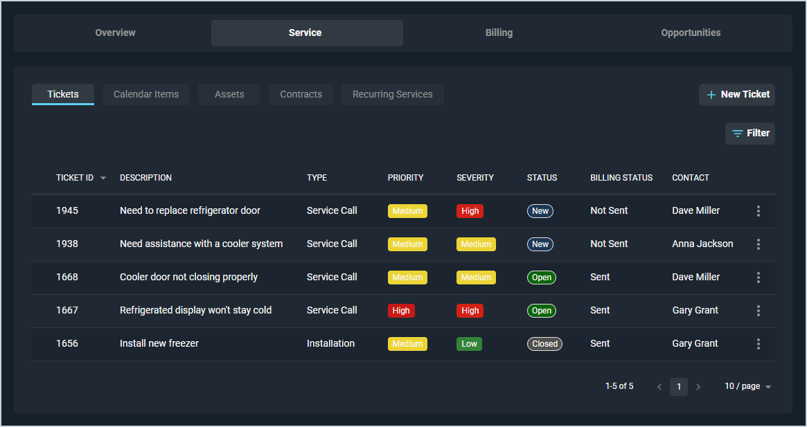 Tickets track customer requests for service and store details for the services provided. See the Ticket List View article for more information on ticketing in Rev.io PSA.