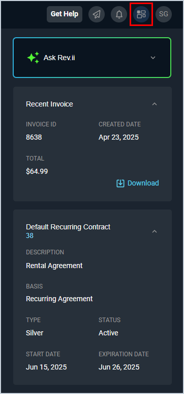 - Gather insights about the customer account by clicking the Ask Rev.ii dropdown and choosing a prompt to view an AI analysis of the customer's activity. For more information about using our in-app AI tool, see the AI-Powered: Ask Rev.ii Widget article.