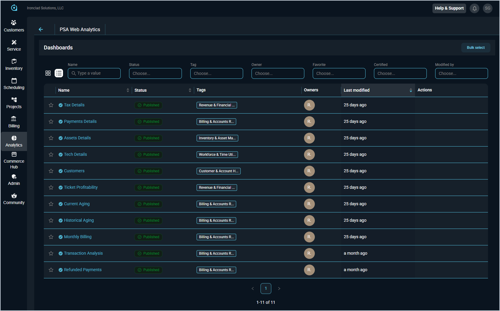 The Dashboards screen in the Analytics module is your starting point for at-a-glance business intelligence. Each dashboard is a curated collection of charts and metrics grouped around a specific area of your business, such as billing, revenue, workforce, or customer accounts. We've developed several standardized dashboards that you can use to unlock instant insights from your data without any configuration.