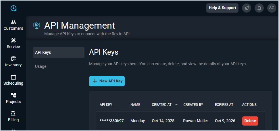 From the API Keys list view, you can delete API keys for your Rev.io instance in just a few easy steps. An API key is a unique identifier that allows secure communication between your Rev.io platform and other applications.