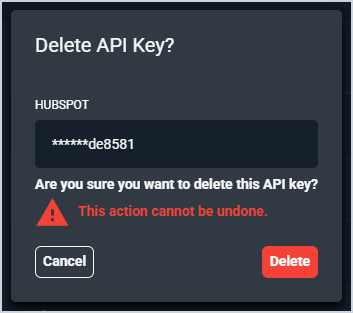 - If you are sure you want to delete the API key, click the Delete button. Otherwise, click the Cancel button. NOTE: If you delete an API key, you will be unable to access it again.