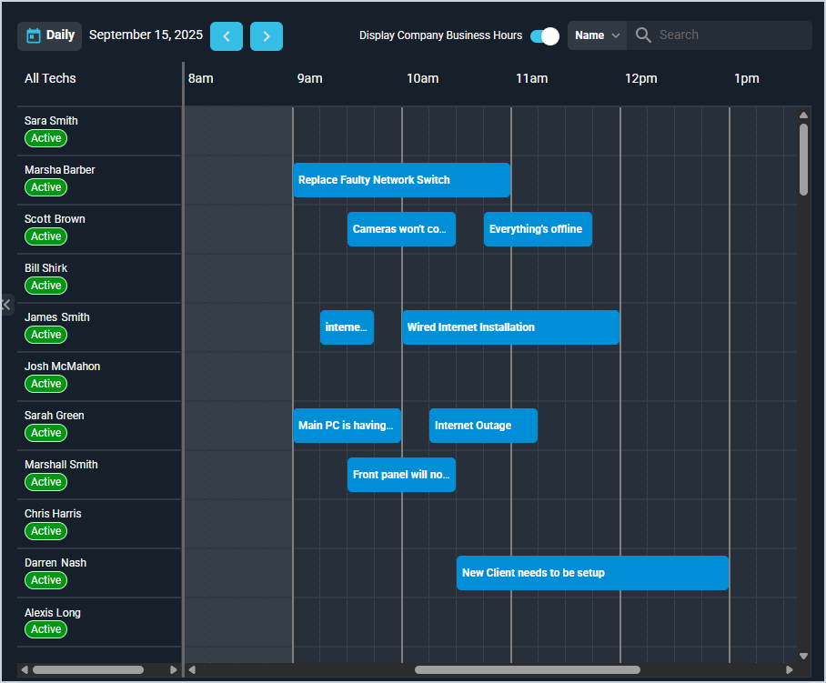 The timeline on the Dispatch Board screen displays a list of techs available in your instance, along with their calendars for the day. From this screen, you can view your technicians' schedules to confirm their availability while simultaneously reviewing tickets that need work in the ticket panel.