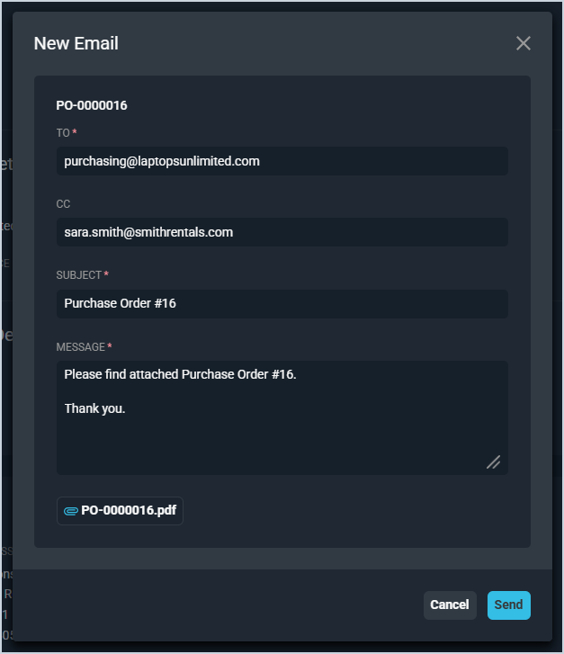 Once a purchase order has been approved, you can send it to the Provider by clicking the Email button on the purchase order. The To field on the New Email window is automatically populated with the provider’s information from their record in Rev.io, and the sender’s email address is added to the CC field for record-keeping purposes. When you click the Send button, the purchase order as a PDF attachment on the email.