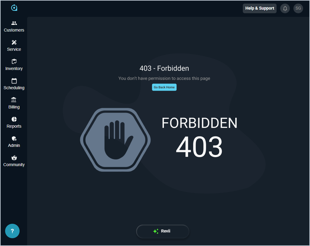 If you attempt to perform an action without the required permissions, the system will display a 403 - Forbidden error screen. This message indicates that you don’t currently have permissions for the feature or action you were trying to use. To resolve the issue, contact your system administrator to confirm and update your permissions as needed.