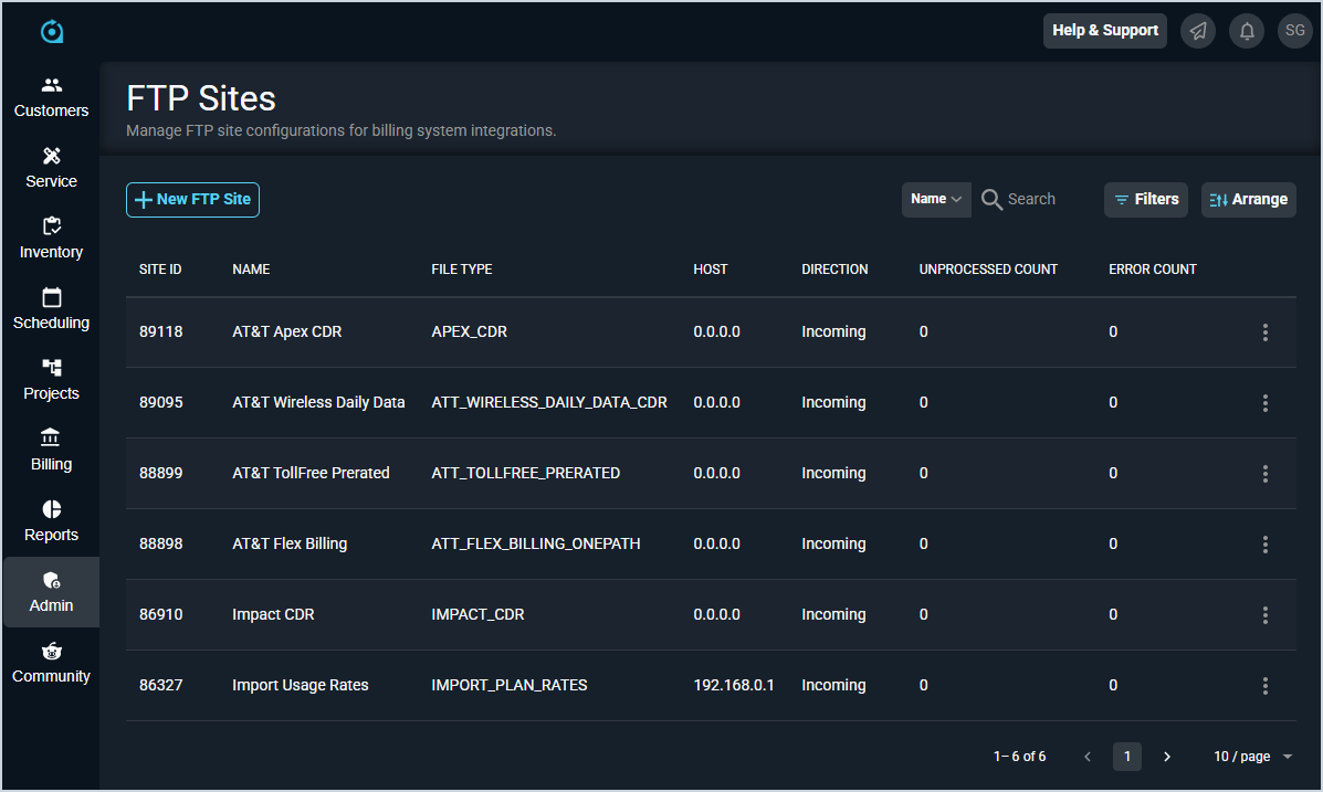 Any provider of ratable products will send Call Detail Reports (CDR) via File Transfer Protocol (FTP) Sites. It is imperative that these sites are monitored regularly to prevent billing errors. The FTP Sites list view displays all FTP sites configured for incoming and outgoing call rating in your instance. From this list view, you can view add, edit, copy, and view various details for the sites. You can also access the site's files.