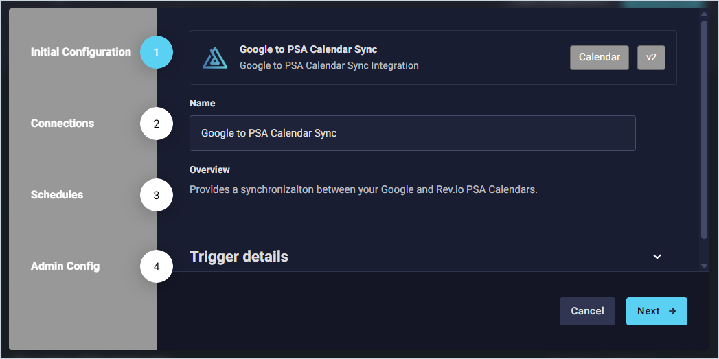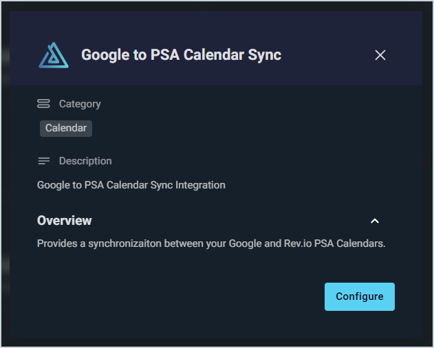 - Each user in your Rev.io PSA environment who wants to sync their Rev.io PSA calendar with their Google calendar will need to complete their individual user configuration. See the Google Integration: User Configuration article for more information.