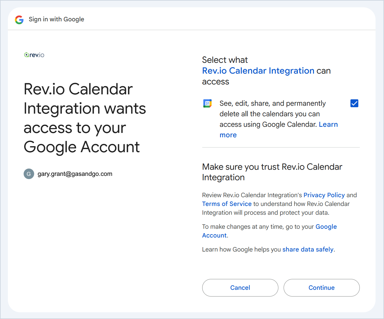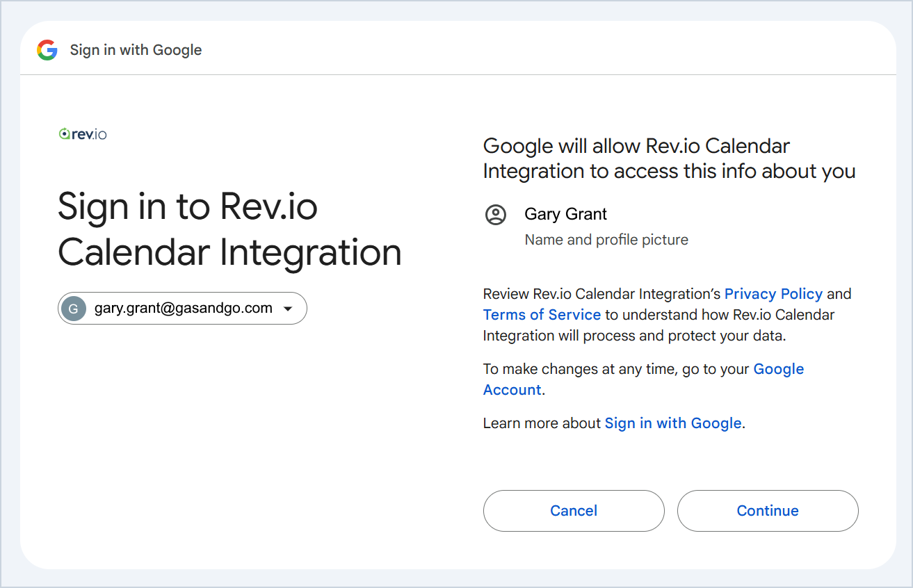 - Click the checkbox to allow Rev.io to access your calendar. Then, click the Continue button.