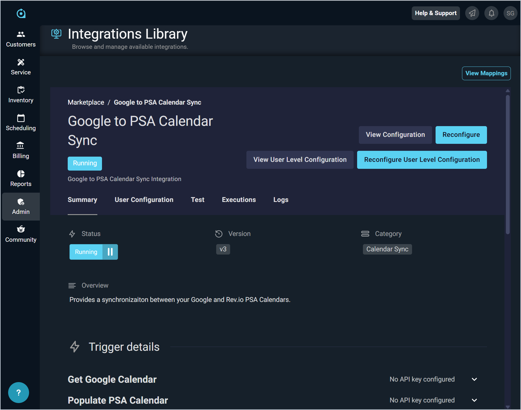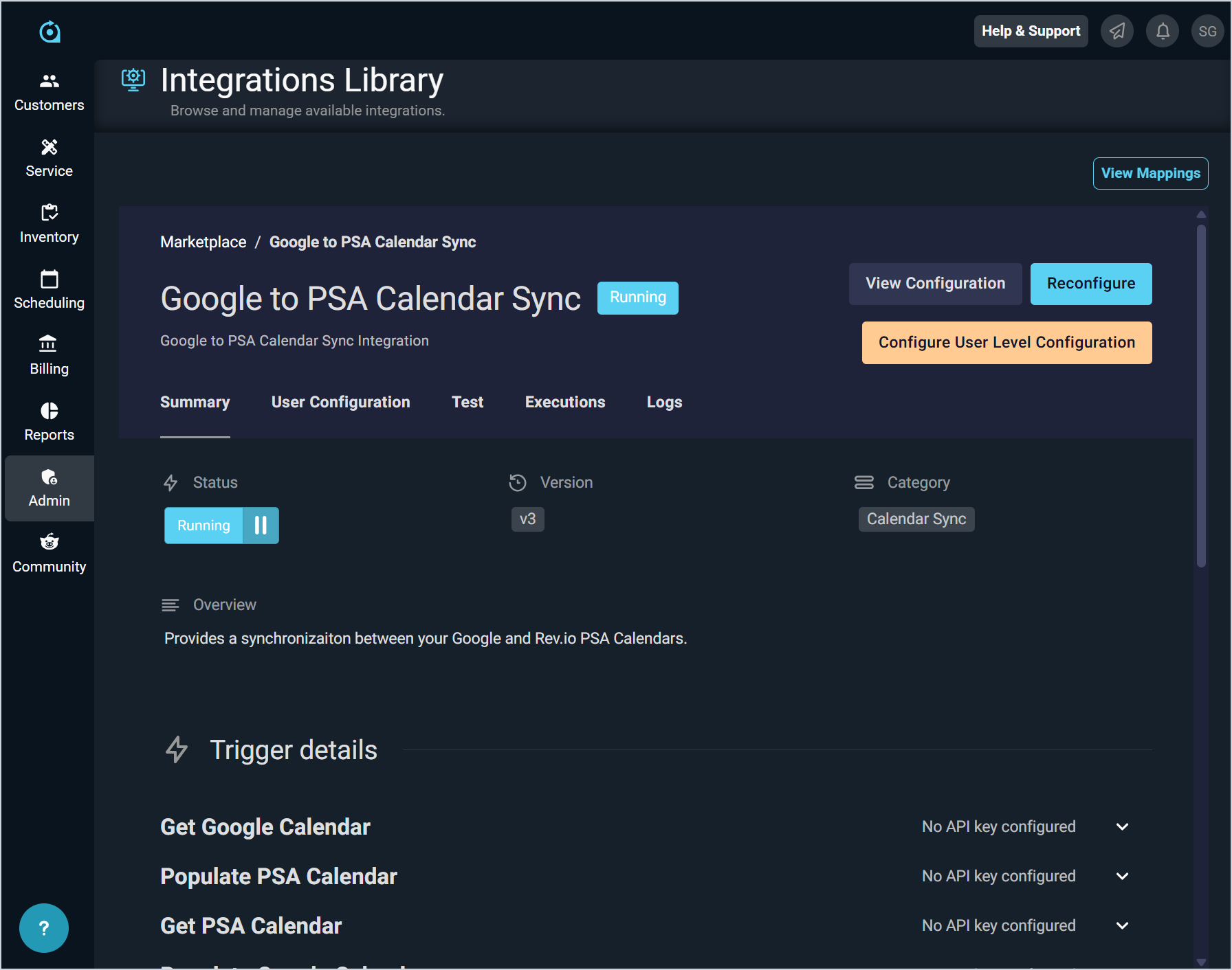 - The system displays a summary of the integration and allows you to reconfigure your integration at any time, if needed.