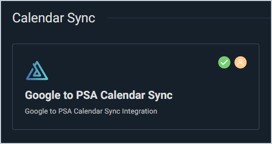- Locate and select Google to PSA Calendar Sync in the Calendar Sync section. A green checkmark indicates that the integration has been deployed to your instance, and an orange user icon indicates that your specific user configurations have not yet been completed. If you do not see these icons, contact an administrator to complete the initial admin configuration. See the Google Integration: Admin Configuration article for more information.