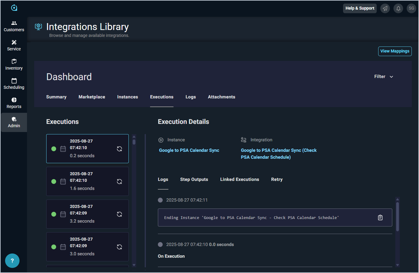 The Executions tab allows you to review the log for each time any of your integrations run or execute in your environment. This tab includes two main sections: the Executions pane and the Execution Details area. The Executions pane displays a log of each execution with the date, time, and duration of the execution. A green circle indicates that the execution was successful and a gray circle indicates that the execution is still in progress.