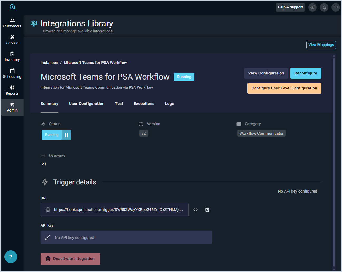 | NOTE: This tab only displays for users with the Manage integrations permission on the Prismatic Integrations permissions tab. |