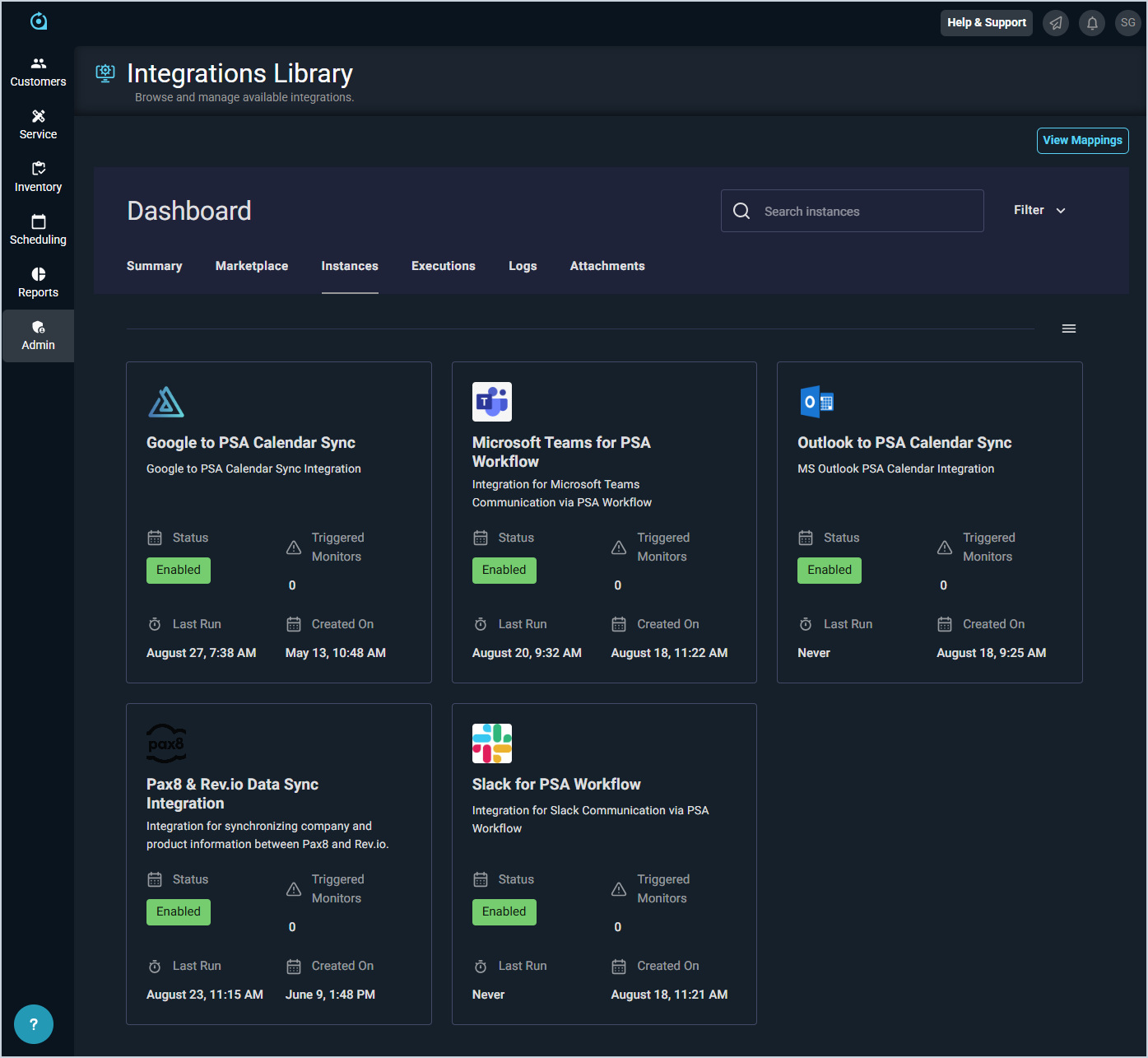 The Instances tab allows you to review the various integrations configured in your Rev.io PSA environment. You can search for your integrations by simply scrolling through the options or by using the Search integrations field at the top of the screen.