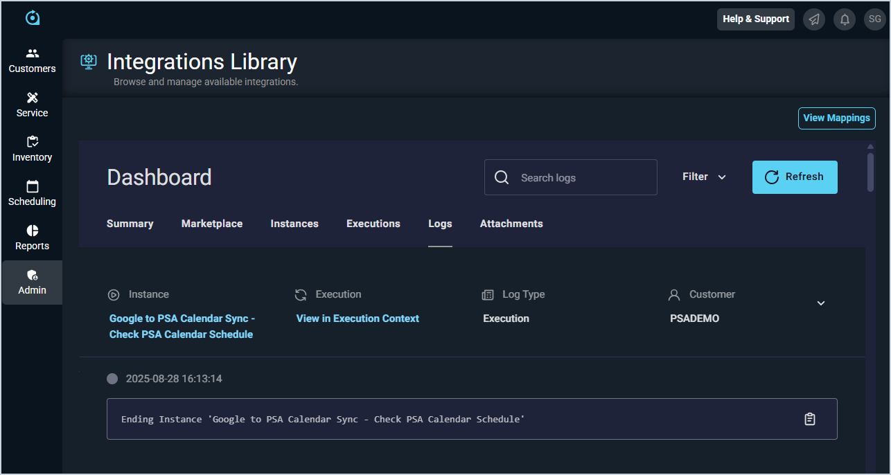 Clicking on any entry on the Logs tab displays more details for the log entry. You can view more details about the integration instance or the execution itself by clicking the links in the Instance and Execution fields.