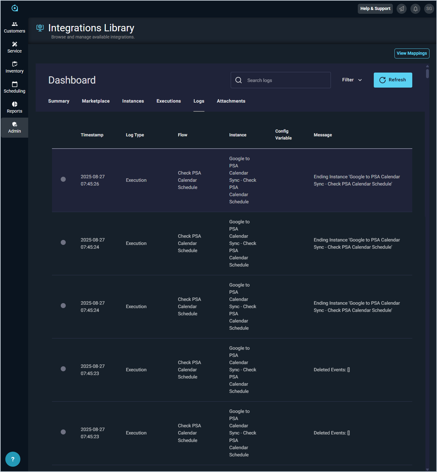 The Logs tab allows you to review the log for all integration activity in your environment. The log shows a Timestamp, Log Type, Flow, Instance, and Message for each entry. You can review the logs by simply scrolling through the options, clicking the column headings to sort the information, or using the Search logs field at the top of the screen.