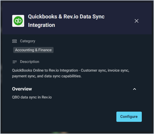 Clicking on any integration on the Marketplace tab displays a pop-up window with more information about the integration and the option to configure that integration for your Rev.io PSA environment. To begin configuring an integration for your environment, simply click the Configure button.
