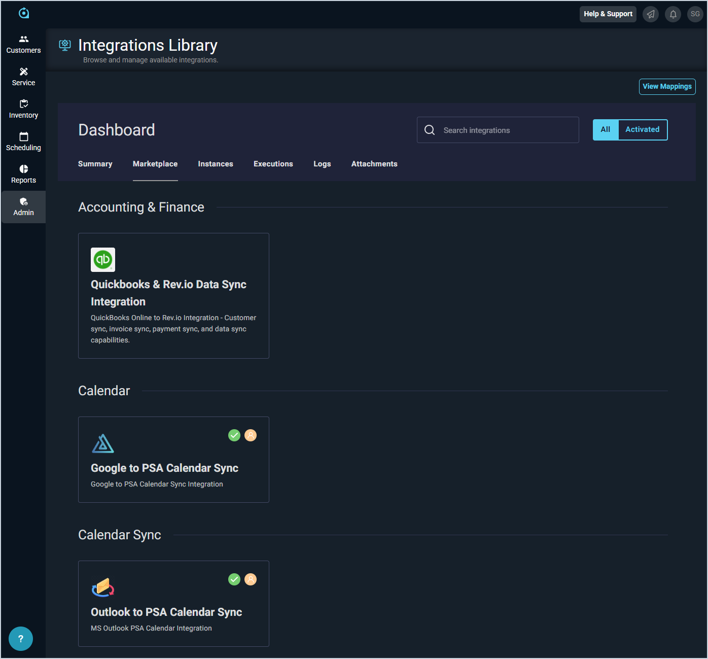 You can also filter the options displayed to only show integrations that are currently active in your Rev.io PSA environment. To do so, simply click the Activated option at the top of the screen. The list of available integrations will update to show only integrations that have been configured for use in your instance by an administrator. Individual users do not need to have configured the integration for it to be included in the list of activated integrations.