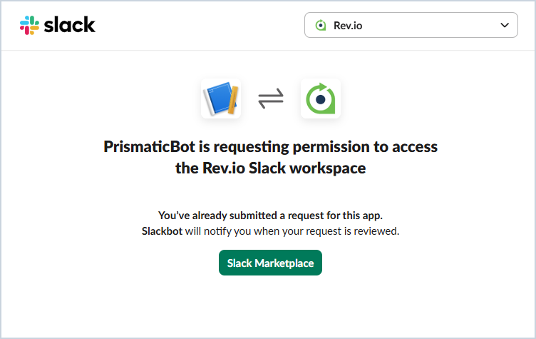 If you try to click the Connect button again in the Integrations Library before your organization's Slack admin has approved your request, you will see a message that our integration is still requesting access to your Slack workspace.