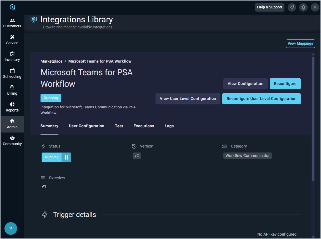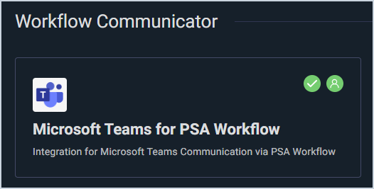 - Locate and select Microsoft Teams for PSA Workflow or Slack for PSA Workflow in the Workflow Communicator section. Two green checkmark icons indicate that the integration has been deployed to your instance and that your specific user configurations have been completed. If you do not see these icons, your Microsoft Team Integration is not configured properly. See the Slack & Teams Integrations: Admin Configuration article for more information.