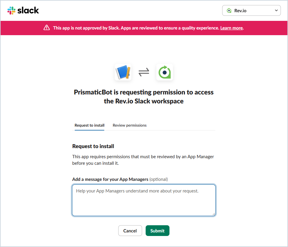 If desired, enter the reason you want to connect Slack to Rev.io (e.g. creating workflow notifications for new tickets) in the Add a message for your App Managers field. Then, click the Submit button. Your organization's Slack admin will need to approve the request before you can continue your Slack configuration.