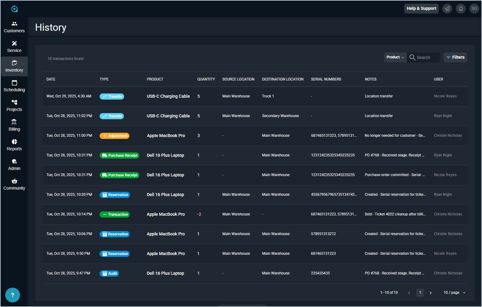 The Inventory History screen provides a complete log of inventory actions taken in the system, including adjustments, transfers, cost changes, purchase receipts, and reservations. It offers a detailed audit trail to help you track and review inventory activity over time.