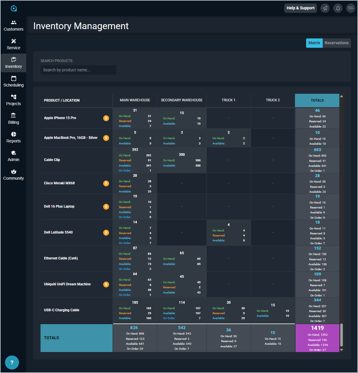 | 7 | Totals (row) | Total quantity at each location of on hand, reserved, available, and on order products. |