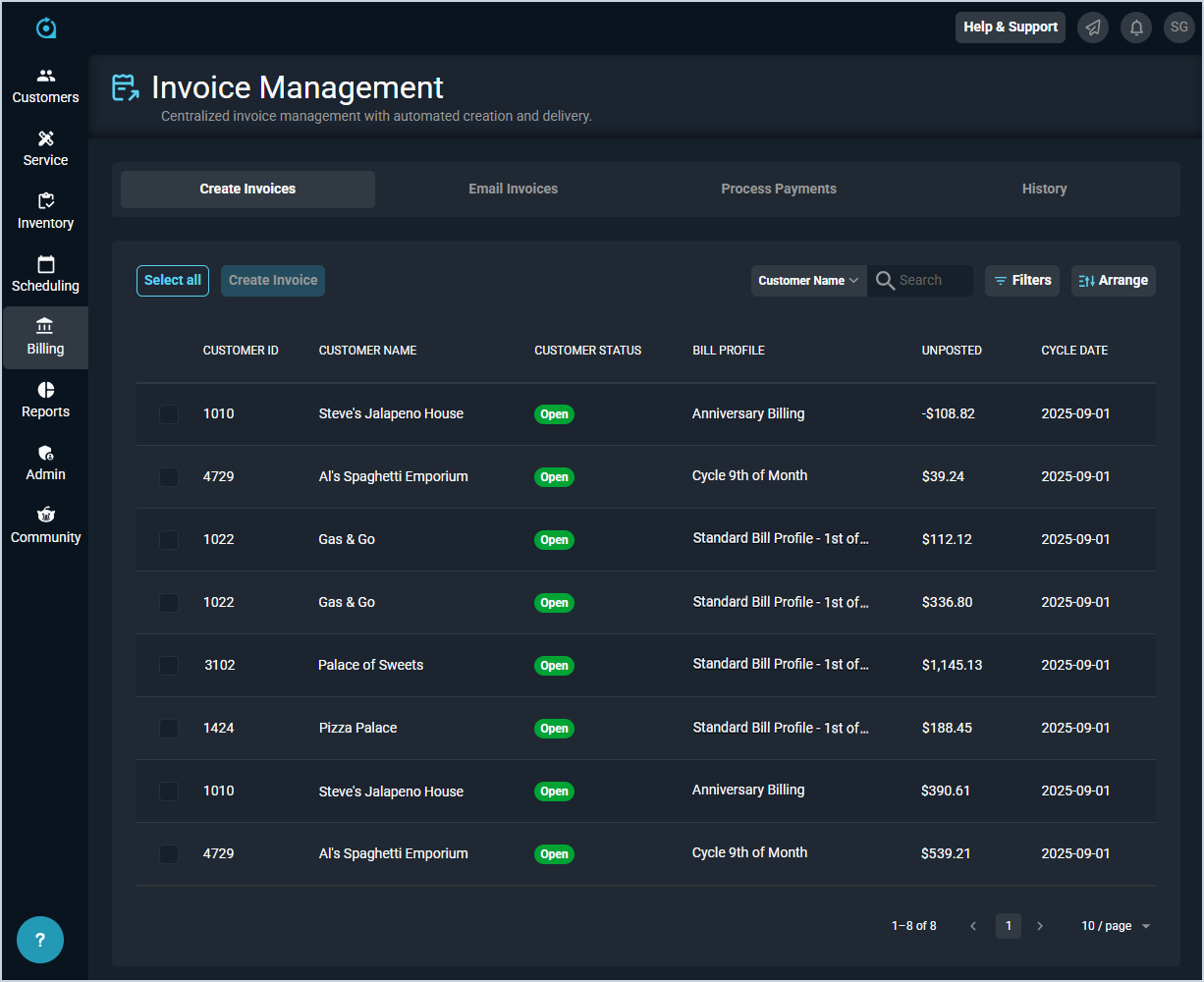The Invoice Management screen allows you to create invoices, email invoices, process payments, and view invoice history. The Create Invoices tab specifically allows you to review customers that have reached their cycle date and have charges on their Unposted tab. Simply select items from the list and click the Create Invoice button to manually create their invoices. In the future, you will be able to automate your bills without manually having to create each batch.
