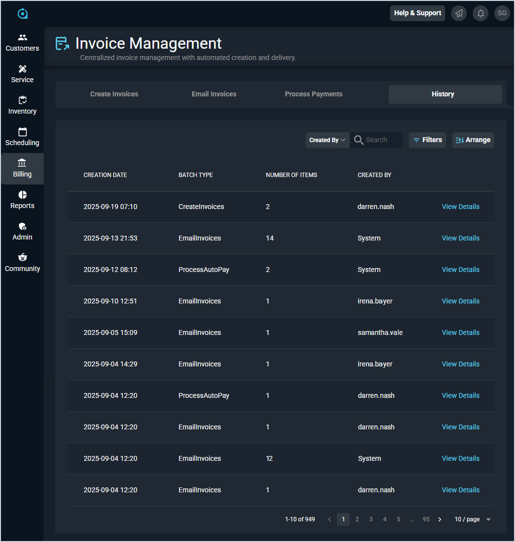 The Invoice Management screen allows you to create invoices, email invoices, process payments, and view invoice history. The History tab specifically allows you to review the history of batch processing on the Invoice Management screen and view additional details for each specific batch.