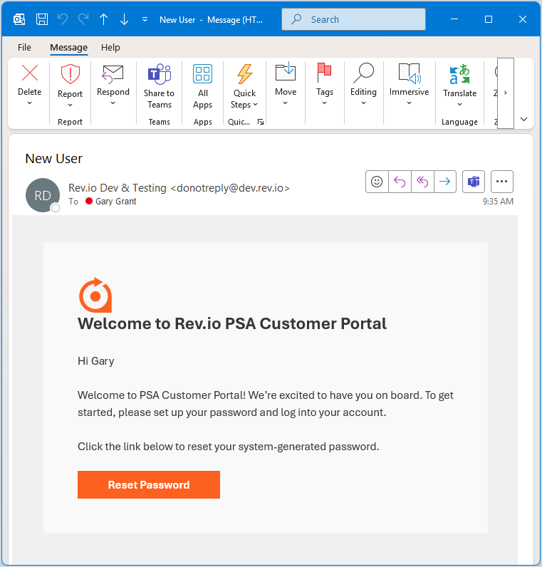- Once you have been added as a portal user, you will receive an email with a link to reset their password for the Customer Portal. The Subject of this email will be 'New User' and the email should display as follows. Click the Reset Password button to get started.