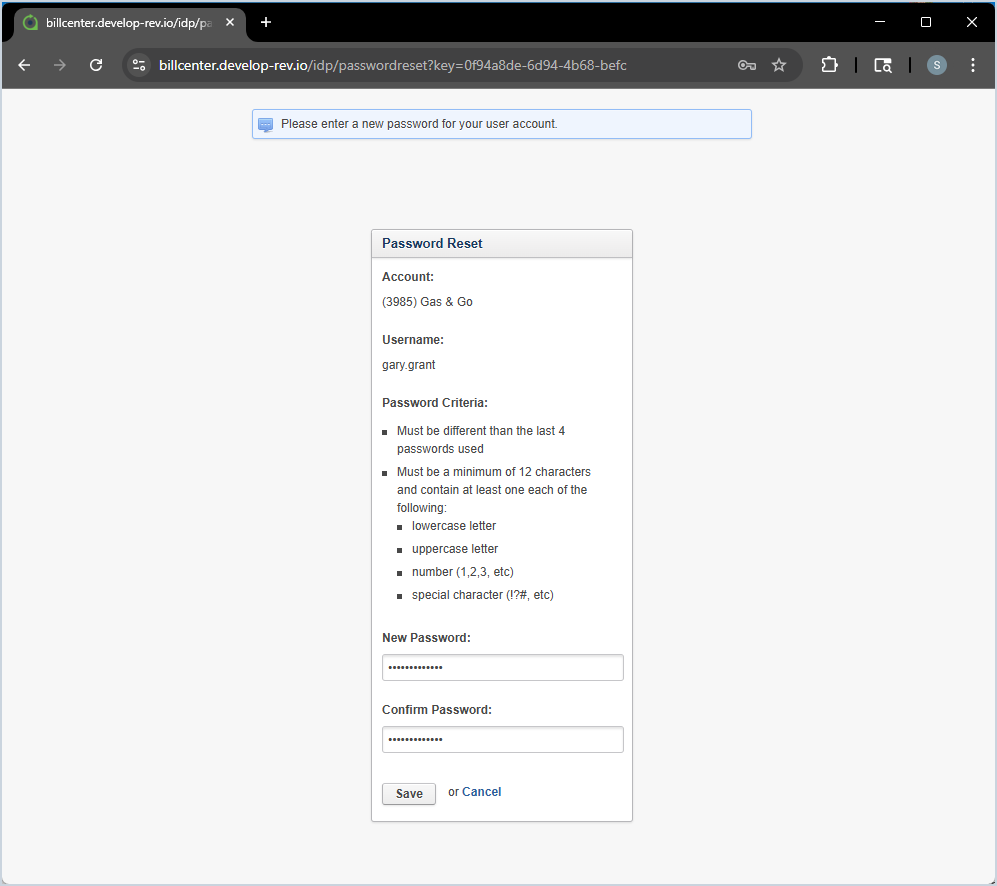 - The Password Reset screen updates to display the Account your customer portal access is tied to and the Username you need to use to log in. Write your Username down as this is the only time you have access to it. Then, enter a password matching the Password Criteria in the New Password and Confirm Password fields.