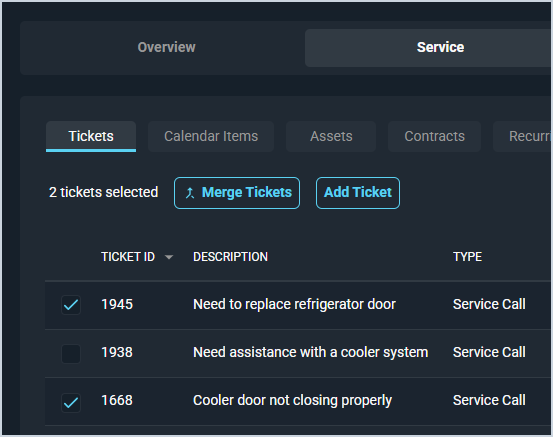 Any tickets in an open, unbilled Status on the same customer account can be merged together from the Tickets tab in the Servicing section of the customer profile screen. On the Tickets tab, select the tickets you want to merge and click the Merge Tickets button to start the merge process.