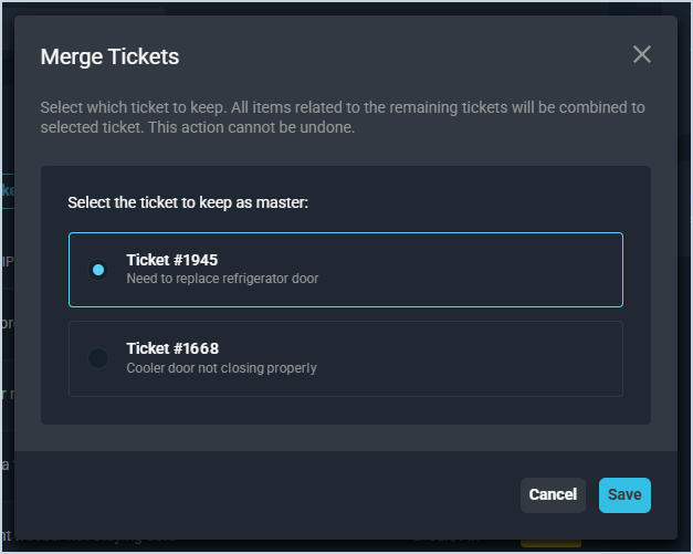 Once you click the Merge Tickets button, the Merge Tickets window displays. From here, simply select the ticket you want to become the master ticket and click the Save button. The remaining tickets merge into the selected ticket and a message displays in the lower right corner of the screen, confirming that the tickets were merged.